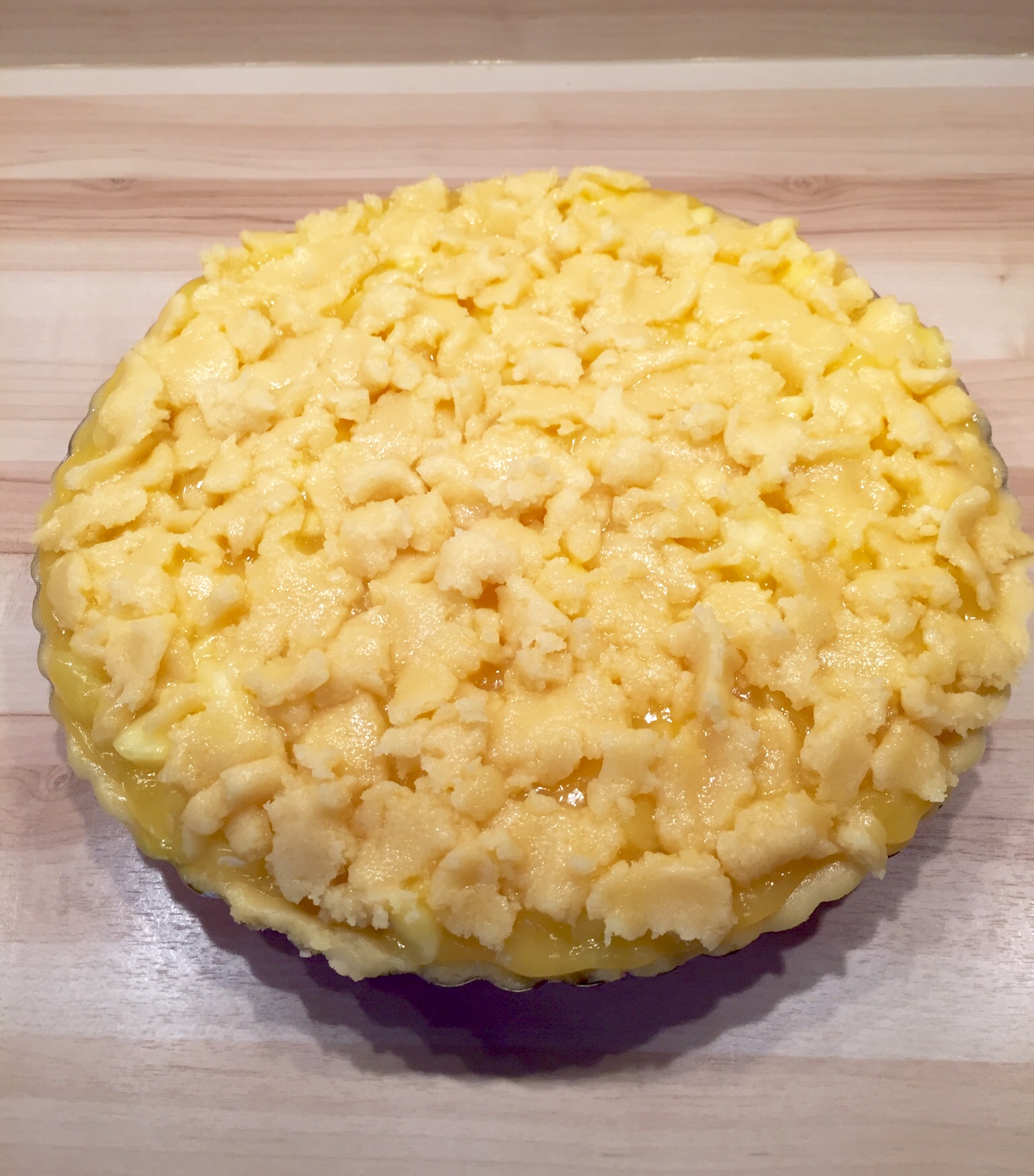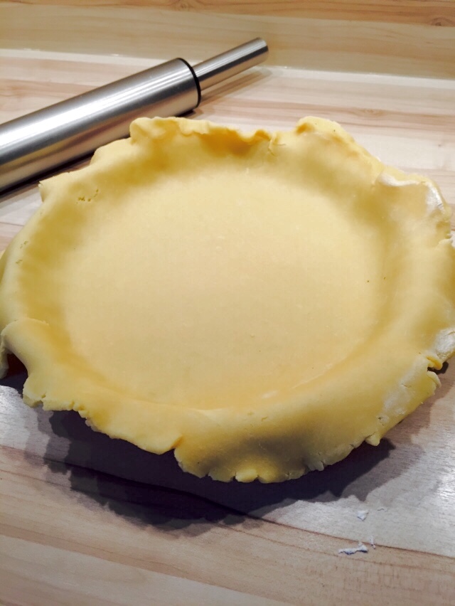 Als erstes eine Tarteform (30 cm Ø) einfetten und mit Mehl ausstäuben. Falls ihr keine Tarteform zur Hand habt, dann genügt auch eine normale Springform. 300 g Mehl und den gesiebten Puderzucker in einer Schüssel vermischen. 150 g Butter in kleine Stückchen schneiden und zu dem Mehl-Puderzucker-Gemisch sowie das Ei hinzufügen. Alles mit dem Knethaken und dann mit den Händen verkneten. Ihr werden sehen, dass es mit den Händen am besten geht. Und es macht auch am meisten Spaß :). Danach den Teig auf der leicht bemehlten Arbeitsfläche zu einem Kreis ca. 35 cm ausrollen. Jetzt kommt der heikle Part. Vorsichtig den Teig in die Form heben, sodass die ganze Form bedeckt ist. Den Rand andrücken. Falls der Teig beim rüber heben reißen sollte, ist das absolut nicht dramatisch. Der Teig lässt sich auch in der Form noch gut „kitten“ und sehen wird es so oder so keiner. Den überschüssigen Teig könnt ihr gerne auf dem Boden verteilen.