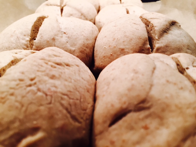 Nachdem der Teig 2 Stunden gehen konnte, ihn in 8 gleichgroße Stücke teilen, jeweils zu einer runden Kugel formen und etwas in die Länge ziehen. Ein Backblech mit Backpapier auslegen und jeweils 2 Teigstücke nebeneinander und 4 untereinander legen, sodass sie sich berühren.