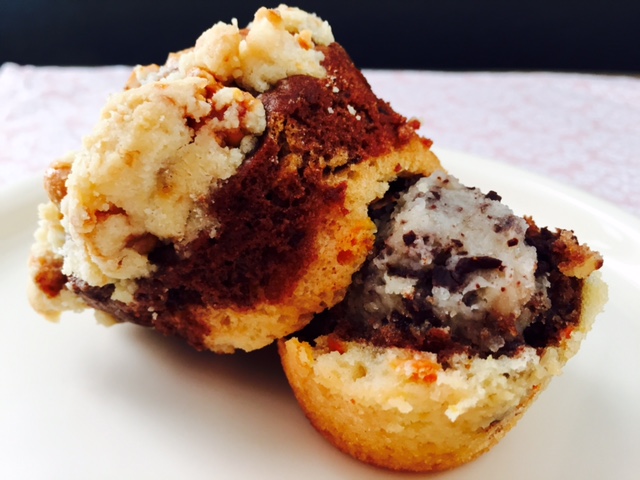 Erst den hellen und danach den dunklen Teig auf die Muffinförmchen verteilen. Eine Gabel studelartig durch den Teig ziehen. Nun die Cookie Dough Kugeln aus dem Kühlschrank nehmen und jeweils eine Kugel in eine Muffinform drücken bis diese komplett vom Teig verdeckt ist. Schlussendlich die Streuselmasse auf die Muffins verteilen und für 20-25 Minuten in den Ofen geben.