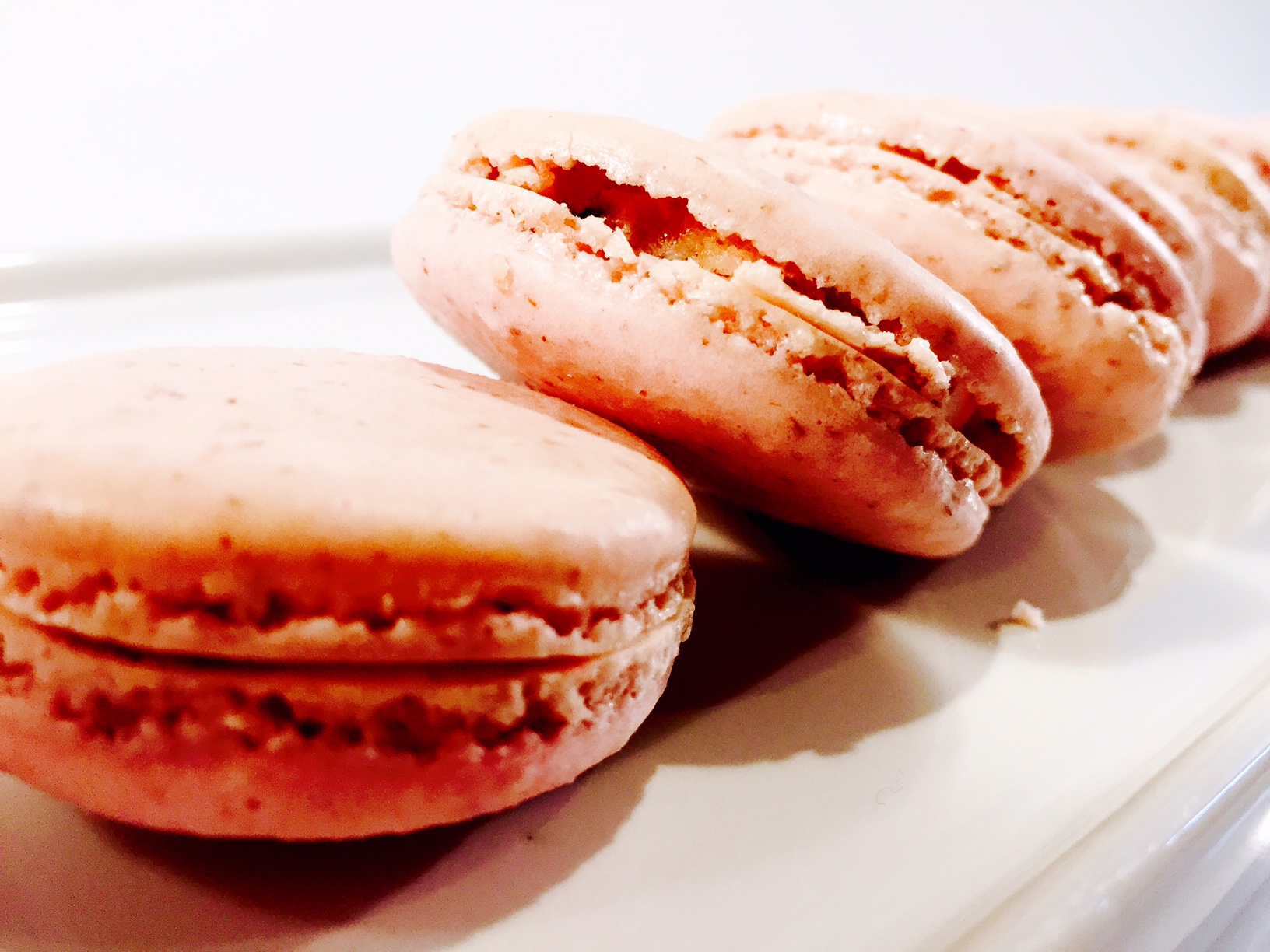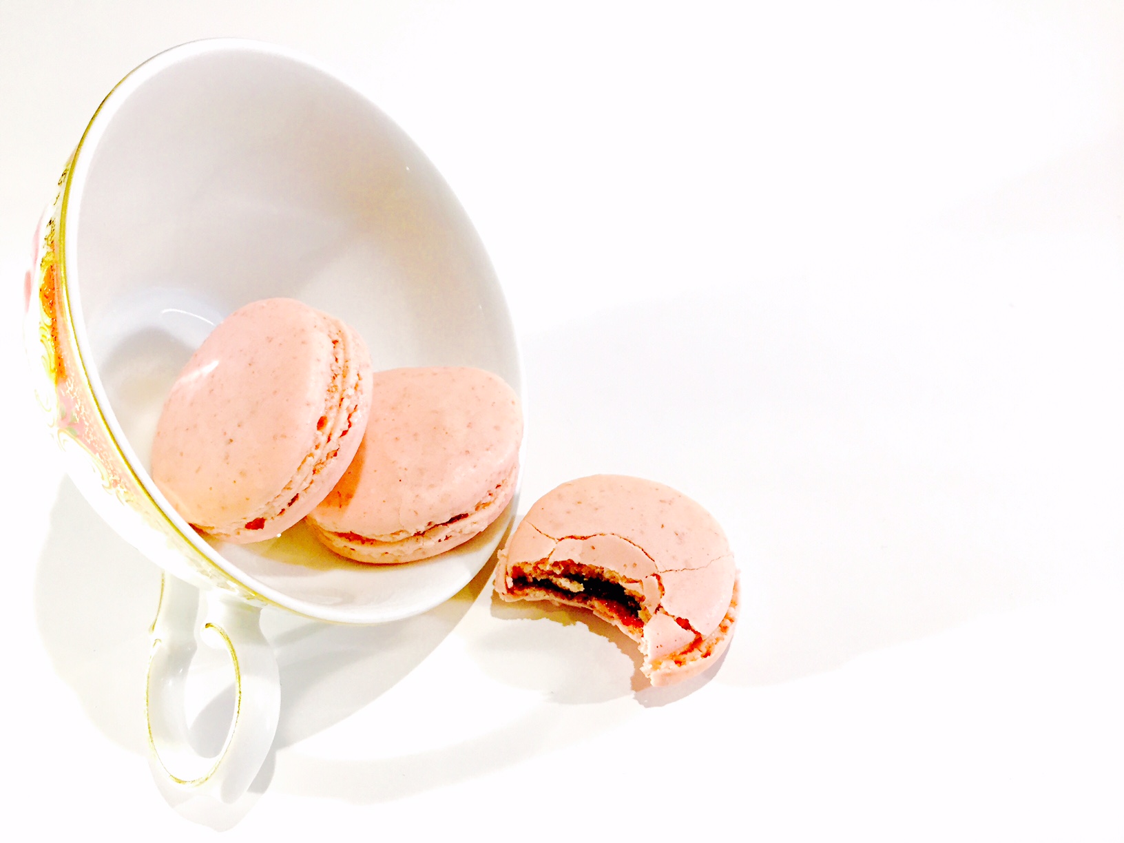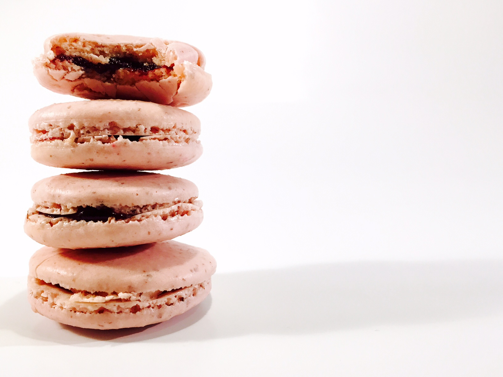 Nachdem sie vollständig ausgekühlt sind, macht einen Klecks Marmelade auf die Unterseite eines Macarons und setzt einen Deckel rauf. Fertig sind die niedlichen Macarons.