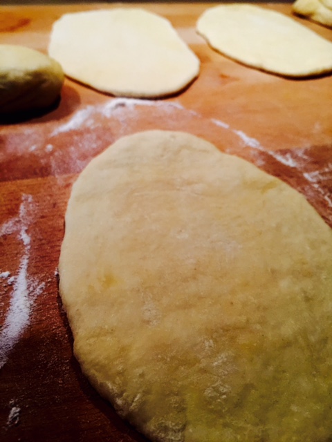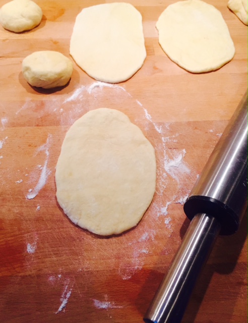 Mit dem Teigroller jede Kugel auf einer bemehlten Arbeitsfläche zu einen ovalen Fladen ausrollen (ungefähr 18 x 10 cm).