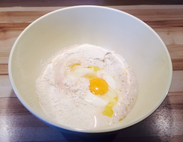 Milch lauwarm erwärmen und 1 TL Zucker und 1 TL Hefe hinzugeben und für 25 Minuten beiseite stellen. Den Backofen auf 50 C° vorheizen und wieder ausmachen. 250 g Mehl und 1/2 TL Salz mischen und dann Öl, Joghurt, Ei und die Hefemilch dazugeben.