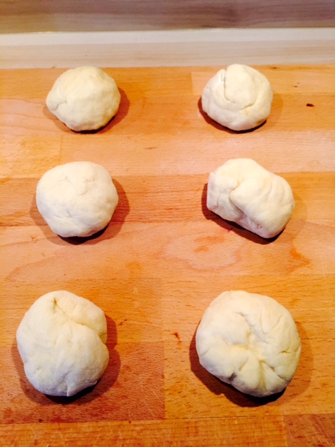 Nach dem „Gehen“ den Teig noch einmal ordentlich durchkneten, sodass er elastischer und besser formbar wird. Nun den Teig in 6 gleichgroße Kugeln formen. Ich wiege hierzu den Hauptteig und teile ihn einfach durch 6 :).