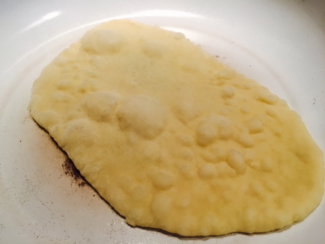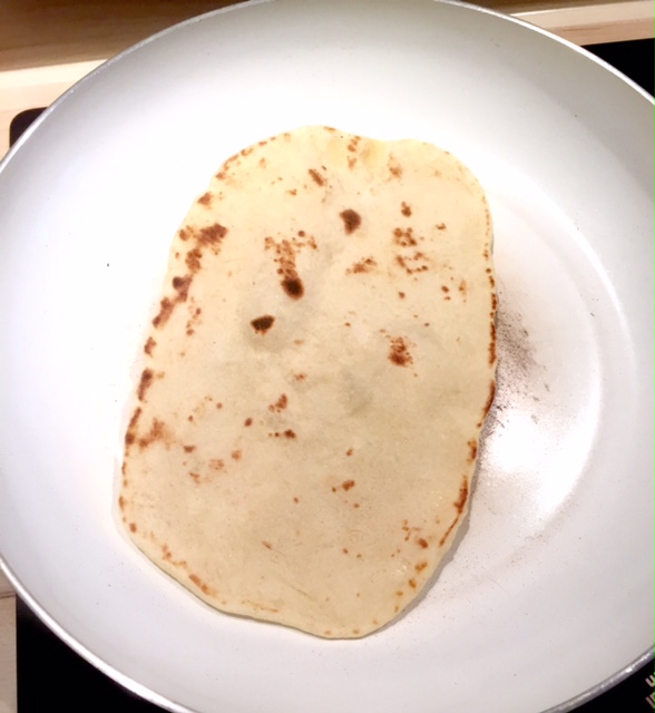 Jetzt kommt der beste Teil. Nehmt euch eine größere Pfanne und lasst sie richtig schön heiß werden. KEIN Fett verwenden. Nun die Fladen einzeln von jeder Seite ca. 1-2 Minuten goldbraun braten. Hier entstehen die lustigen kleinen Bläschen. Wenn das geschieht, dann das Brot wenden.