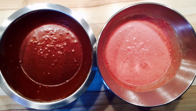 Teilt den Teig gleichmäßig in zwei Schüsseln auf. In die Eine gebt ihr den Kakao hinzu und in der Anderen die Marmelade sowie die Lebensmittelfarbe.
