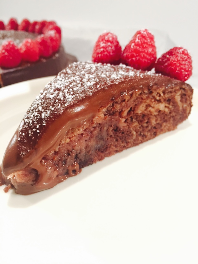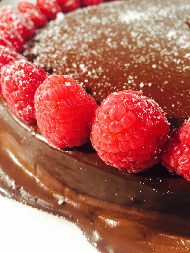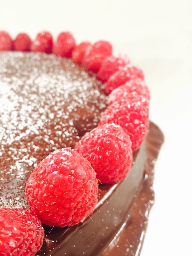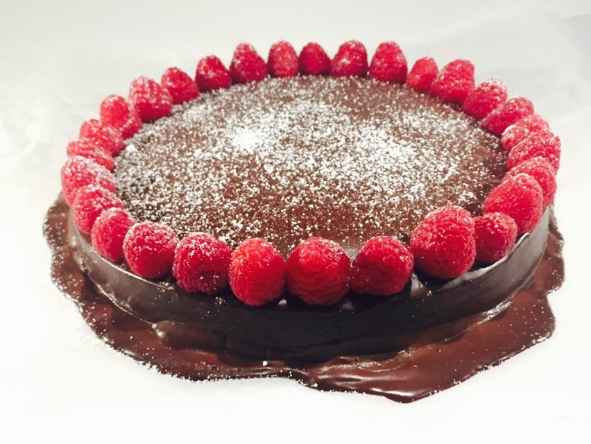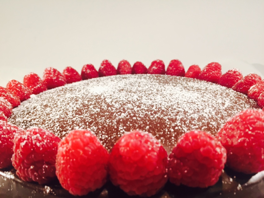 Nun die Schokoladencreme über den Kuchen verteilen, die Himbeeren am Rand verteilen und mit etwas Puderzucker bestäuben.