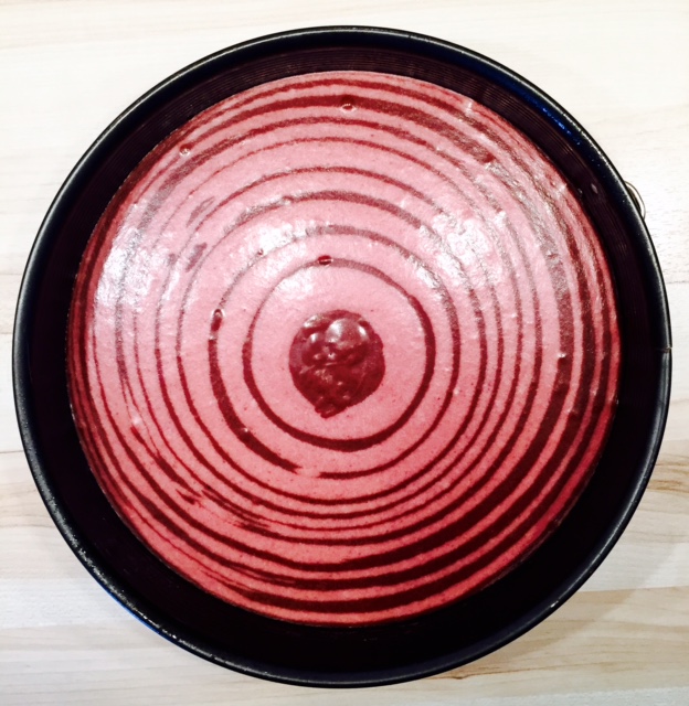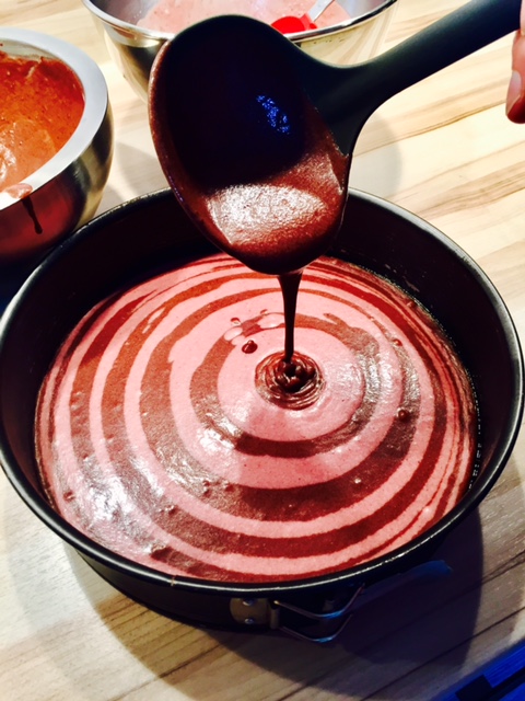 Jetzt kommt der spannende Teil. Bei diesem Schritt habe ich mir wieder eine Küchenhilfe geschnappt, damit alles schneller geht. Gebt nun abwechselnd mit einer Kelle den Teig in die Kuchenform. Angefangen wird von der Mitte aus, sodass zum Schluss der Zebraeffekt entsteht. (Ich habe mich um den Kakaoteig gekümmert und mein Partner um den Himbeerteig – immer im fliegenden Wechsel.)