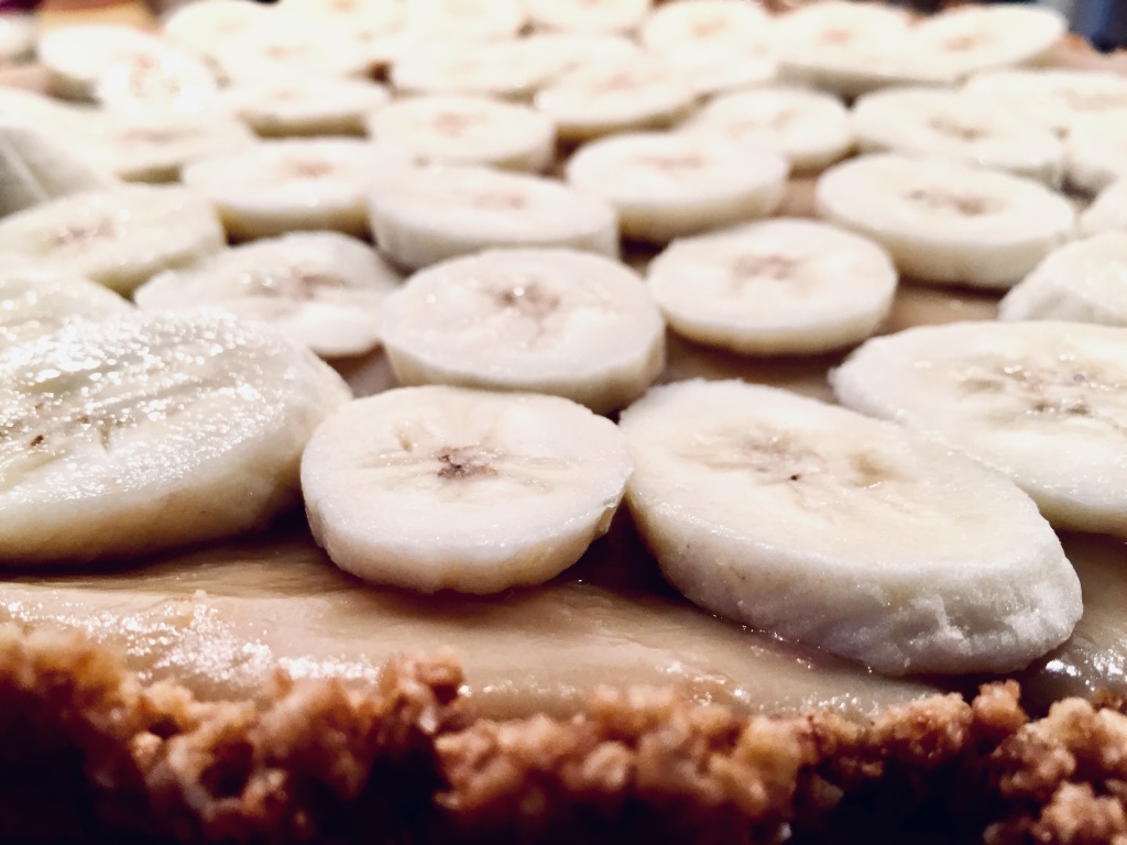 Während das Karamell abkühlt, die Bananen in feine Scheiben schneiden und die Sahne mit dem Mixer steifschlagen. Nach der Stunde Abkühlzeit die Bananenscheiben auf dem Boden verteilen und die Sahne darüber geben. Mit etwas Kakaopulver bestreuen und nur noch genießen. Warum kommt kein Zucker in die Sahne? Weil der Kuchen durch das Karamell schon süß genug ist. Glaubt mir :).
