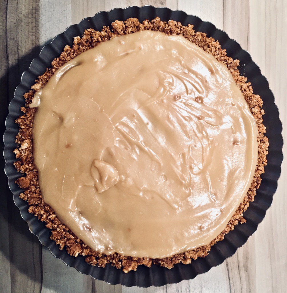 Sobald die Mischung etwas dicker geworden ist und Karamell zum Verwechseln ähnlich sieht, die Pfanne beiseite stellen und etwas abkühlen lassen. Anschließend das Karamell über den Keksboden verteilen und für mindestens 1 Stunde in den Kühlschrank stellen.