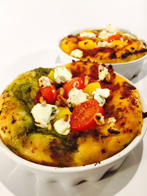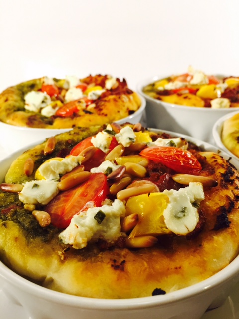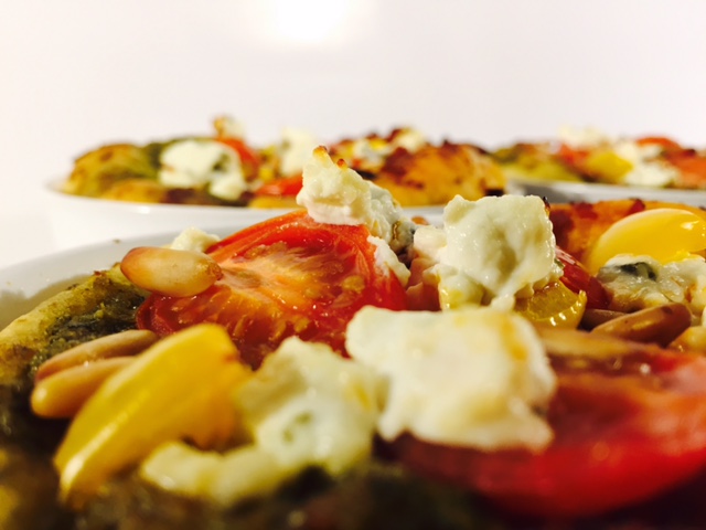 Zunächst Mehl und Salz vermengen. Dann die Hefe in 150 ml warmes Wasser auflösen und zu dem Mehl geben. Alles mit dem Knethaken verrühren, Olivenöl hinzufügen und solange kneten, bis ein glatter Teig entstanden ist. Nun den Teig für ca. 1 Stunde in einer Schüssel an einem warmen Ort gehen lassen. Auf einer bemehlten Arbeitsfläche den Teig ausrollen (ggf. in die Tarte-Förmchen drücken) und mit den oben genannten Zutaten belegen und im vorgeheizten Ofen bei 200 °C Umluft für 10-15 Minuten backen.
