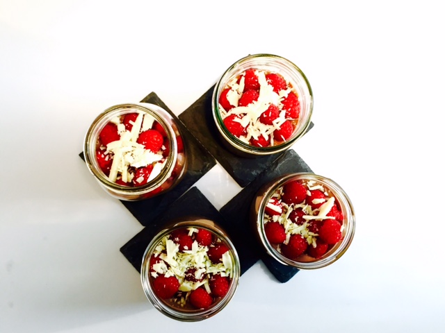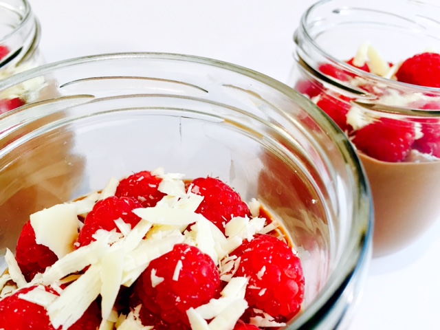 Die Creme auf die 4 Gläser verteilen und die Himbeeren darauf setzen. Die restlichen 50 g von der weißen Kuvertüre raspeln und auch darüber streuen. Fertig ist die super leckere Schlemmerei.