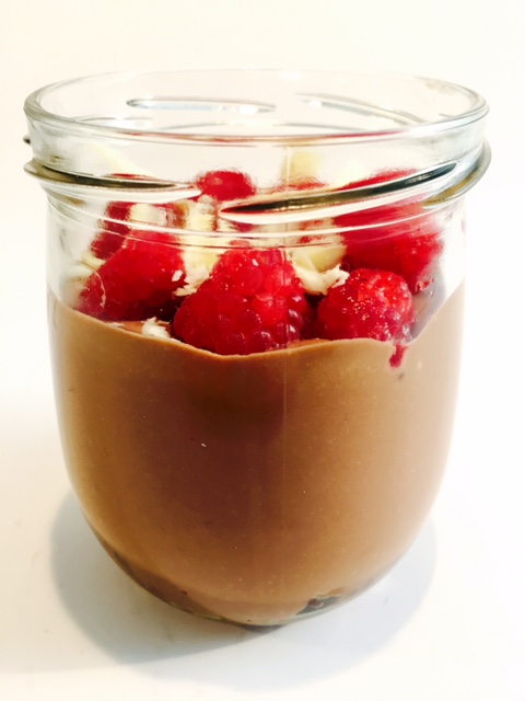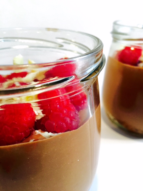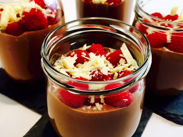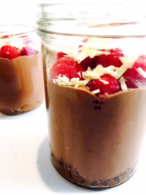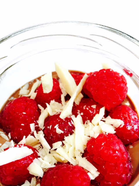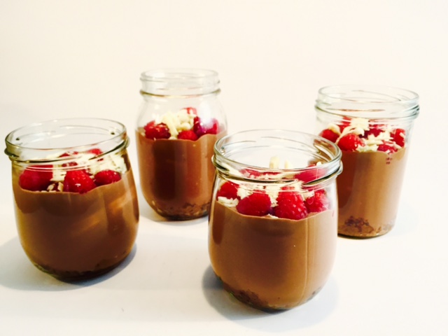 Heute gibt es etwas für Schoko-Liebhaber. Eine leckere Creme aus dunkler und weißer Schokolade, Zucker und Sahne, getoppt von süßen Himbeeren. Der Boden besteht aus zerkleinerten Cookies und einem Schuss Orangensaft :).