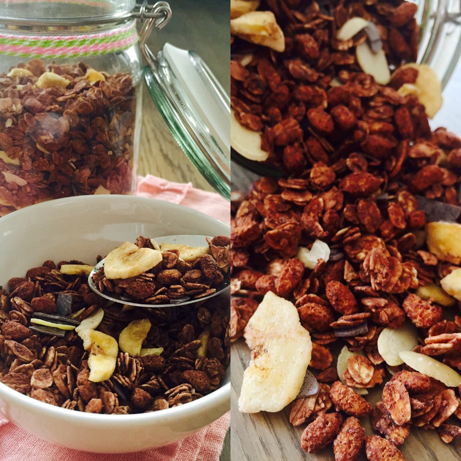 Zum Schluss die restlichen Mandelblättchen, Schokoraspel und die Bananenstücke unter die Masse mischen (und eventuell eure frei gewählten Zutaten). Fertig ist eurer selbstgemachtes Schokomüsli!