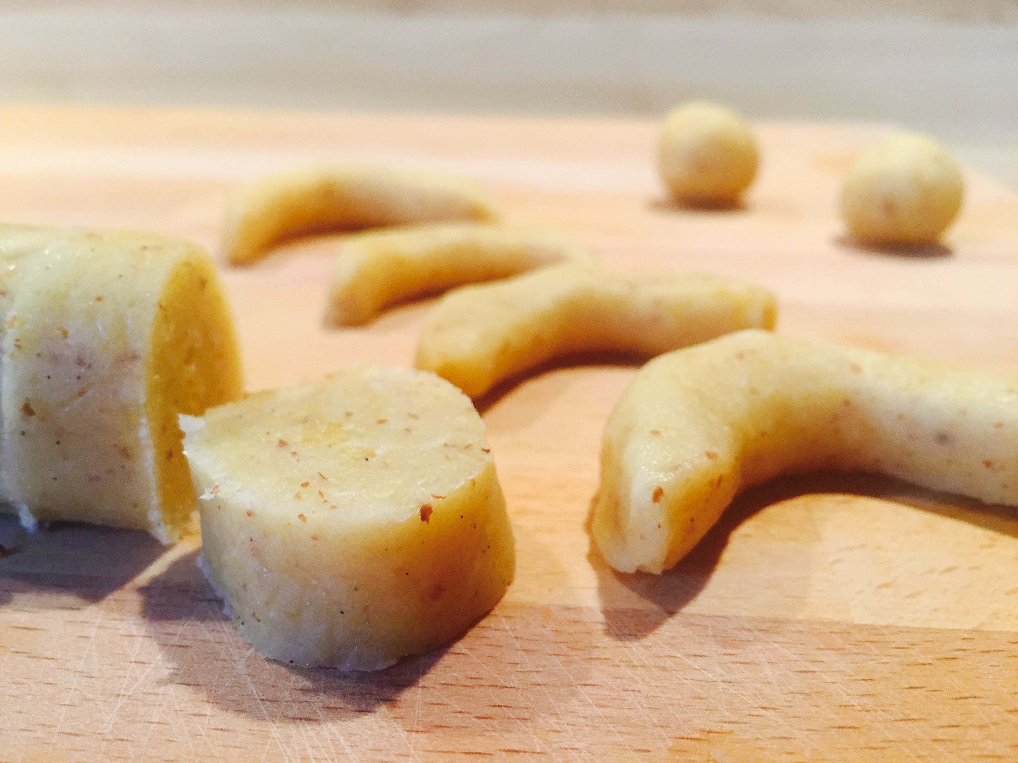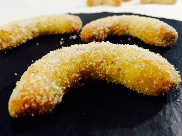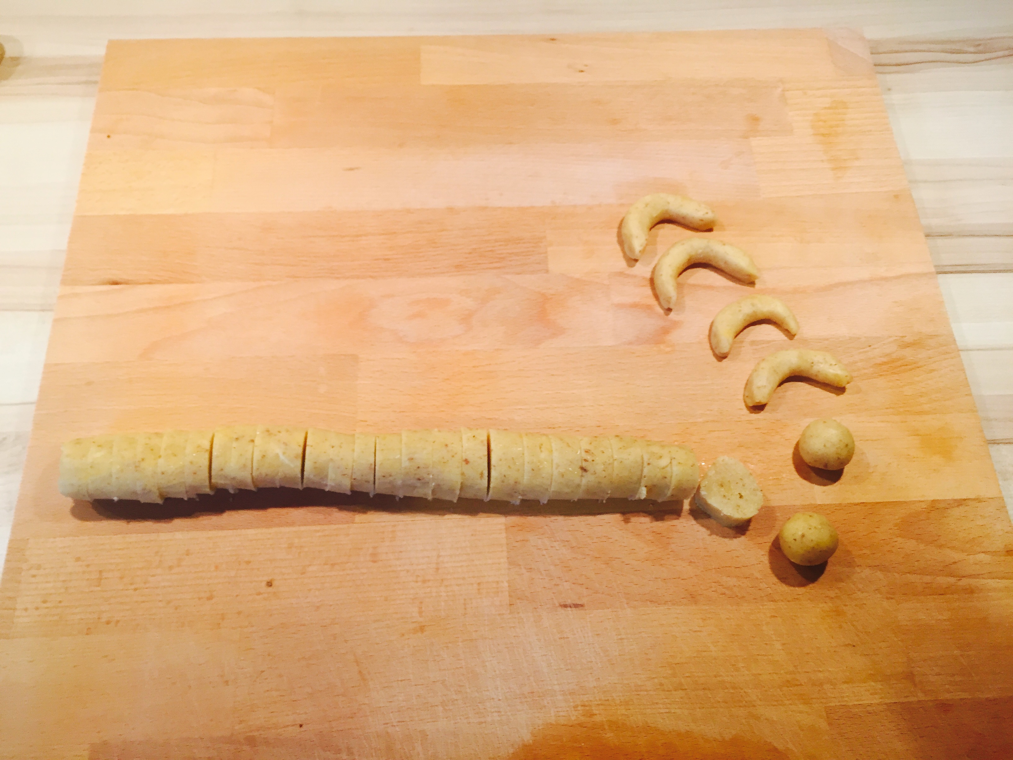 Den Backofen auf 160 °C Umluft (180 °C Ober-/Unterhitze) vorheizen. Eine Rolle aus dem Kühlschrank holen und in 35 Scheiben schneiden (ca. 0,5 cm breit). Jede Scheibe mit der Handinnenfläche zu einer Kugel und dann zu einer 5 cm langen „Wurst“ rollen:). Anschließend die „Würste“ zu einem Hörnchen formen, sodass sie die typische Form eines Vanillekipferls bekommen. Sollten sie nun zu weich sein, sie einfach wieder für ein paar Minuten in den Kühlschrank legen und dann auf einem mit Backpapier ausgelegten Blech für 15 Minuten backen.