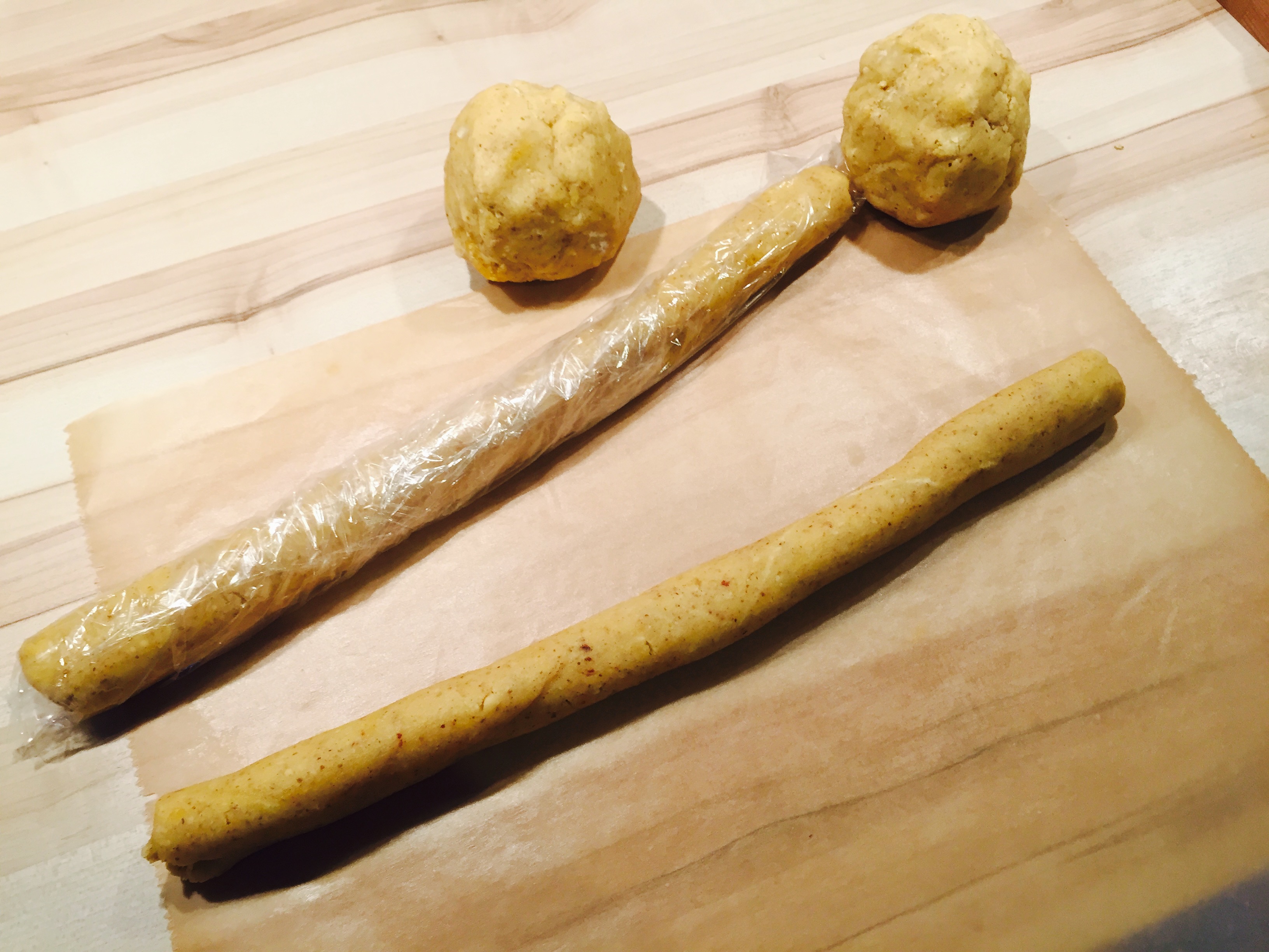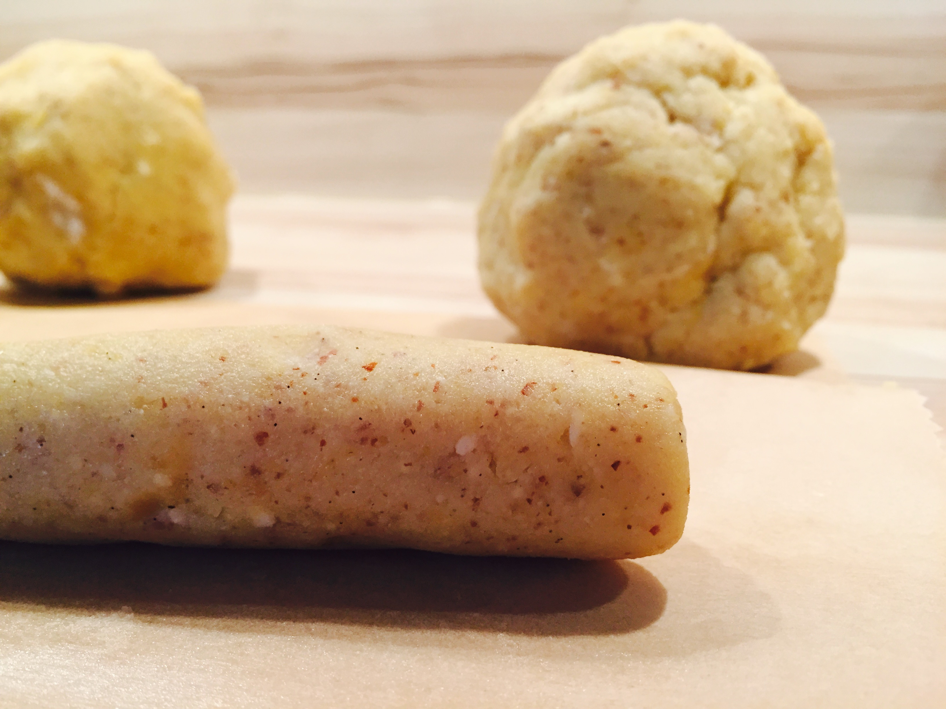 Kalte Butter, Mehl, Zucker, Eigelb, gemahlene Mandeln, Vanillemark und Salz mit dem Knethaken verrühren und dann ganz fix mit den Händen zu einem glatten Teig verkneten. Nun den Teig halbieren und jeweils in ca. 30 cm lange Rollen formen. Beide jeweils in Frischhaltefolie wickeln und für mindestens 2 Stunden in den Kühlschrank legen, sodass die Butter wieder hart wird.