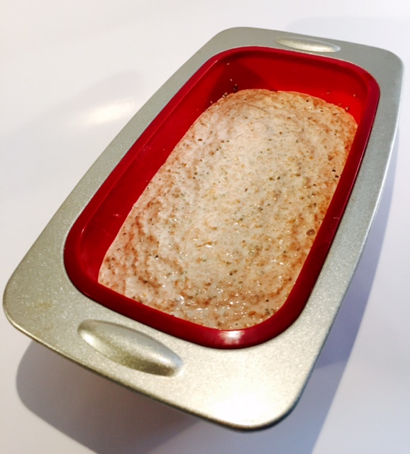 Nachdem der Teig 15 Minuten gegangen ist, 400 ml Wasser und 2 EL Apfelessig hinzufügen und mit einem Knethaken verrühren. Den fertigen Teig in eine gefettete Kastenform (ca. 1 1/2 l) geben und weitere 30 Minuten gehen lassen.